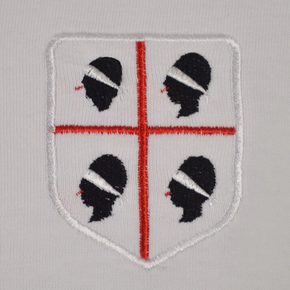This jersey features a crisp white body contrasted by striking red and blue vertical stripes on the v-neck collar and sleeve cuffs. The chest is adorned with a premium embroidered Cagliari badge, ensuring an authentic vintage aesthetic that stands out on the terraces or in the streets.