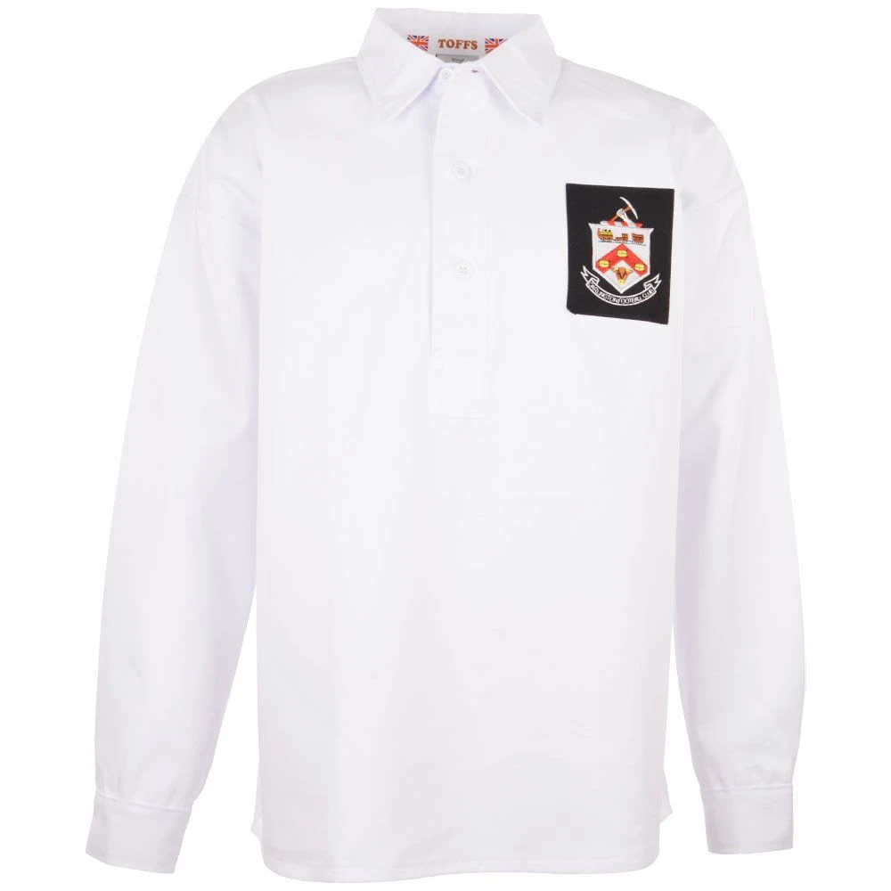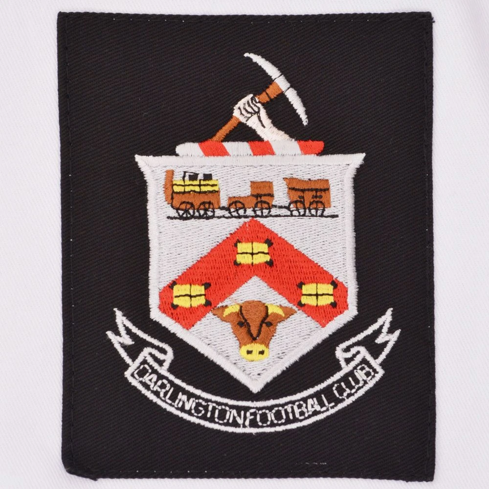 This shirt features a clean white heavy drill cotton construction, synonymous with the durable kits of the mid-20th century. The long-sleeve design and classic button placket collar provide a timeless silhouette, while the detailed embroidered badge proudly displays the Darlington heritage.