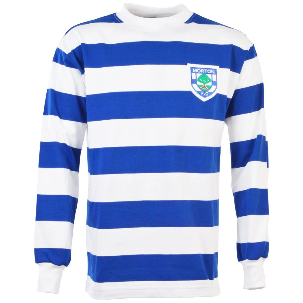 This heritage shirt features the unmistakable blue and white horizontal hoops, meticulously recreated with pre-dyed organic cotton for lasting color depth. The long-sleeve design and traditional round neck offer a timeless silhouette, while the embroidered badge sits proudly on the chest, signifying your loyalty to Greenock Morton.