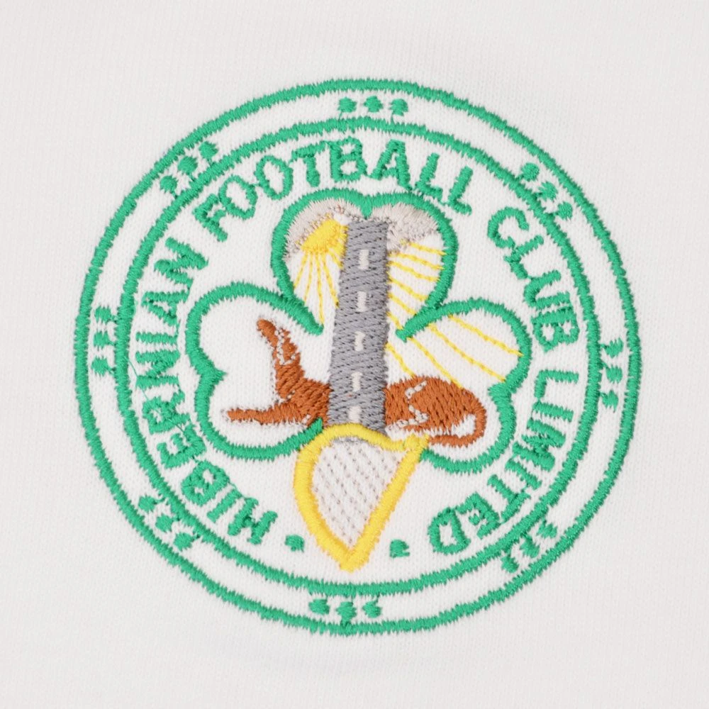 This shirt features a crisp, clean white body as its primary canvas, accented by a striking green and black striped V-neck collar and matching sleeve trim. The iconic club badge is precision-embroidered on the left chest, providing a distinct and high-quality finish that honors the tradition of Easter Road.