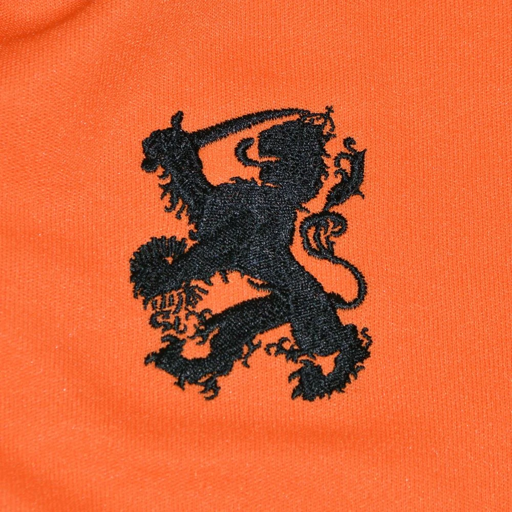 This jacket features a striking vibrant orange body crafted from high-quality heavy pique fabric. It is accented with a clean white zip opening and a traditional stand collar that provides a sharp, athletic silhouette. The chest is adorned with a meticulously embroidered Holland lion badge, capturing the essence of classic international sportswear from a golden era.