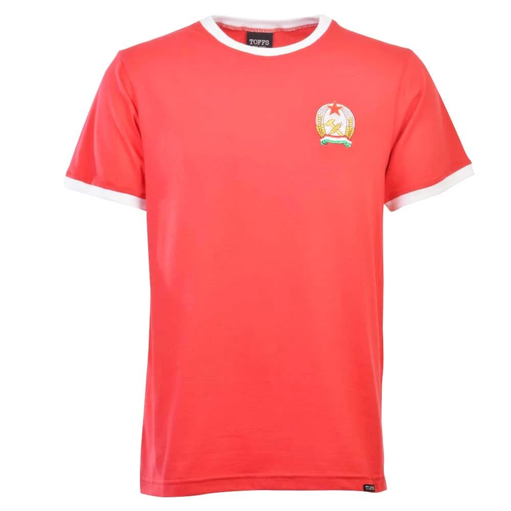 This premium shirt features a vibrant red body contrasted by sharp white ringer detailing on the collar and sleeve cuffs, capturing the iconic national colors. The chest is prominently finished with a high-quality embroidered Hungary badge, offering a textured, premium look that far outlasts standard prints.