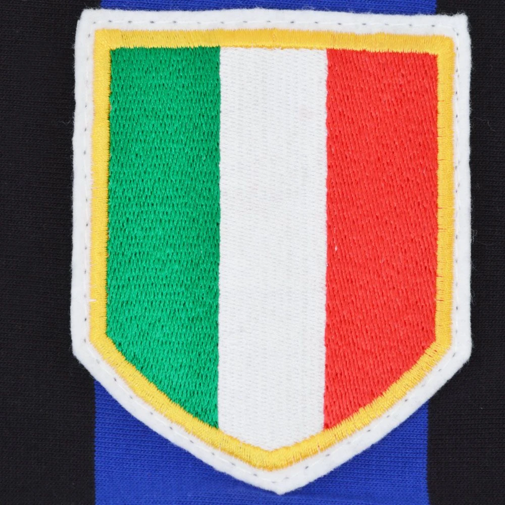 This shirt features the iconic vertical black and blue stripes in a heritage engineered pattern. The design is punctuated by the prestigious scudetto shield badge embroidered on the left chest, signifying their status as Italian champions. The traditional round neck and black ribbed cuffs on the long sleeves provide an authentic mid-60s silhouette that looks as good on the street as it does in the stands.