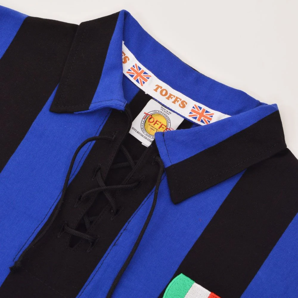 This premium reproduction captures every detail of the mid-century original. It features the iconic wide vertical Black and Blue stripes that have defined the Nerazzurri for over a century. The standout vintage feature is the traditional white lace-up neck collar and long sleeves, providing an authentic heritage silhouette. Each shirt is meticulously finished with a high-quality embroidered club badge on the chest for a timeless look.