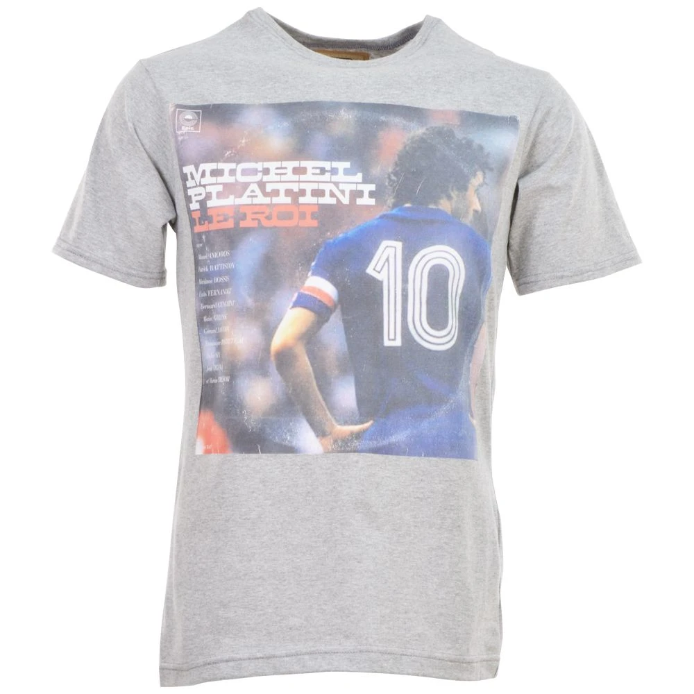 This heather grey shirt features a high-definition digital illustration of Michel Platini, capturing the legendary playmaker in a minimalist yet striking artistic style. The neutral grey colorway provides a versatile base for the detailed graphic, making it a perfect match for any casual outfit.