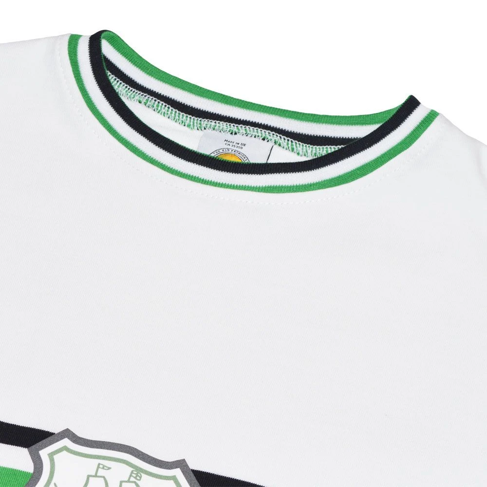 This retro jersey replicates the iconic aesthetic of the era with its signature forest green body, beautifully contrasted by a bold white round neck collar and matching white cuffs. The chest features the traditional circular Plymouth Argyle F.C. printed badge, showcasing the historic Mayflower ship, a symbol of the club’s identity since the early 20th century.